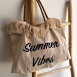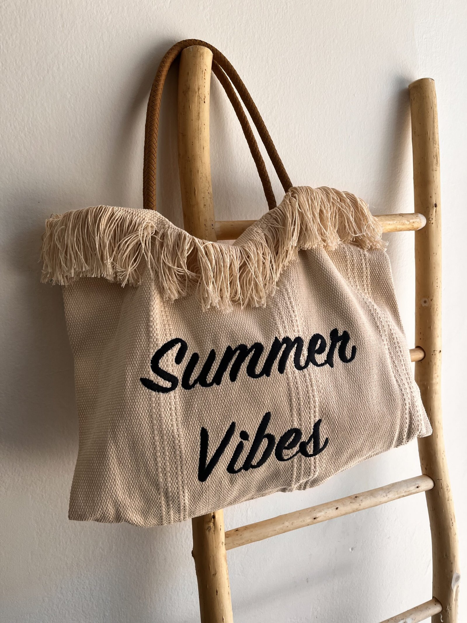 Este bolso veraniego esta confeccionado en una tela texturada suave y resistente. Presenta un diseño natural con flecos decorativos en la parte superior y la frase «Summer Vibes» estampada al frente, que le da un toque relajado y playero.