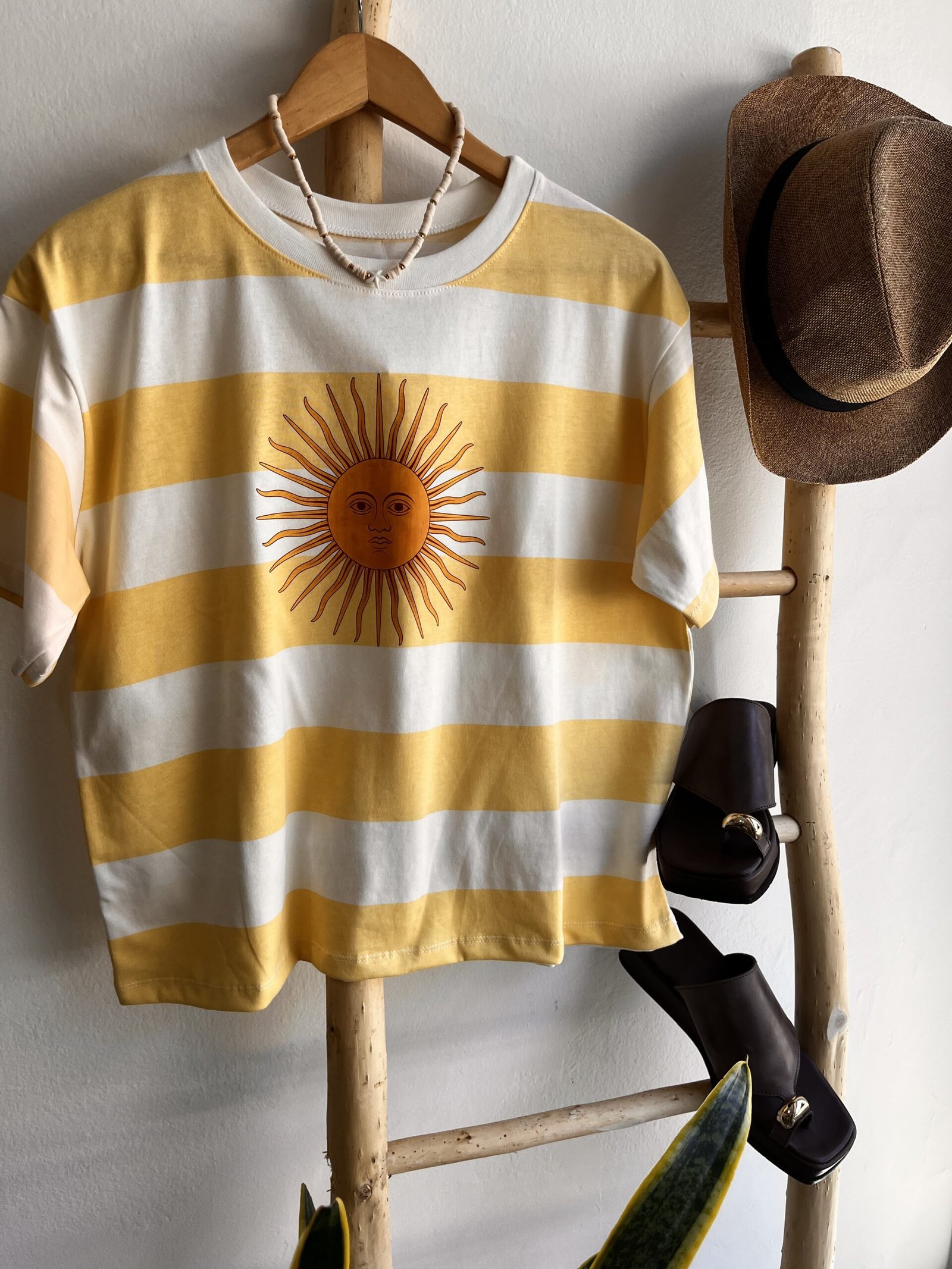 La Remera Sol Patria es una de esas prendas que combinan estilo, comodidad y un toque de identidad que la hace única. Diseñada en un algodón suave y de excelente calidad, ofrece una caída relajada y un calce como ideal para usar todos los días. Sus rayas anchas amarillo y blanco aportan frescura, luz y un aire veraniego perfecto para cualquier plan: desde una tarde tranquila hasta una salida casual.