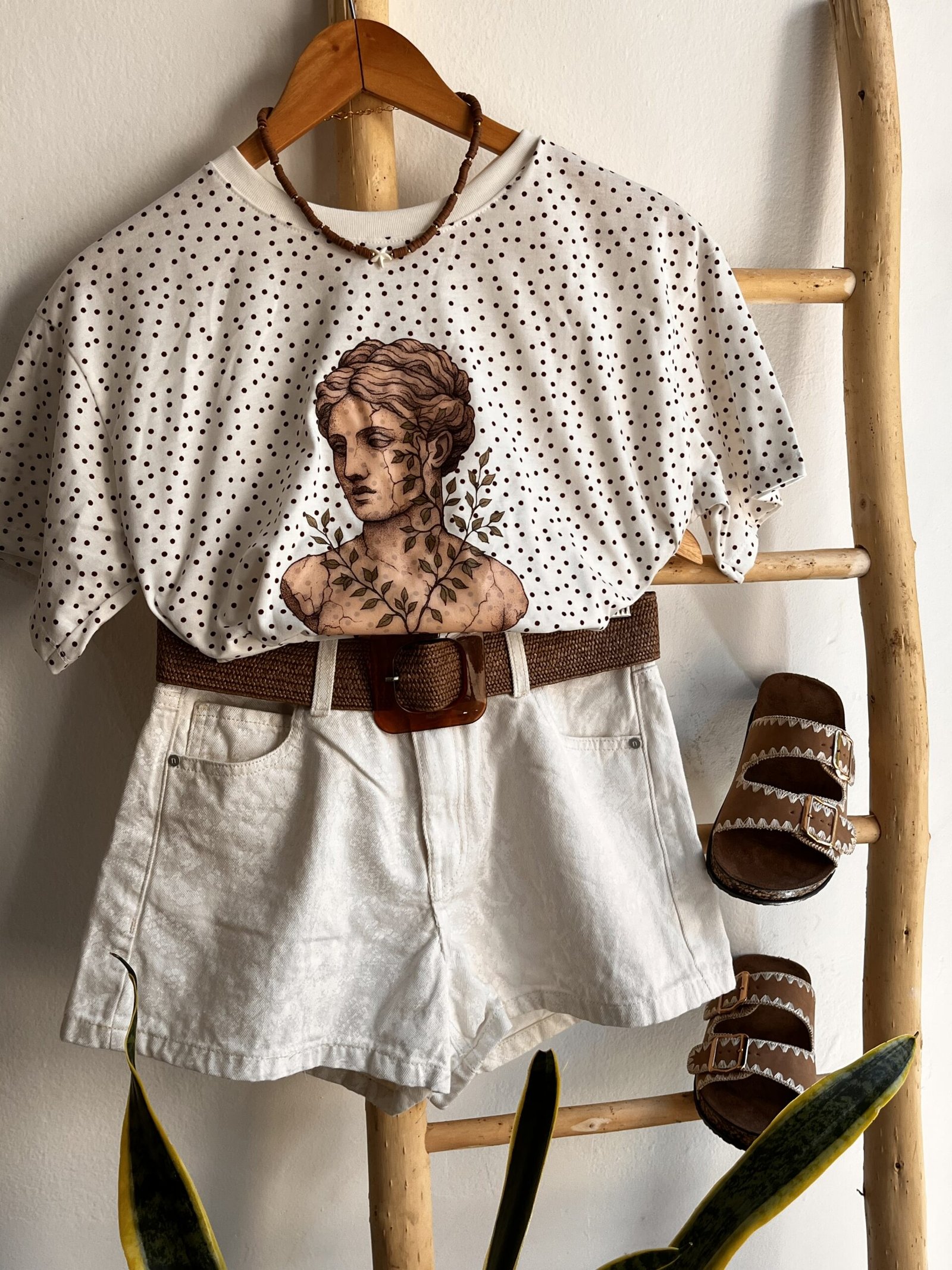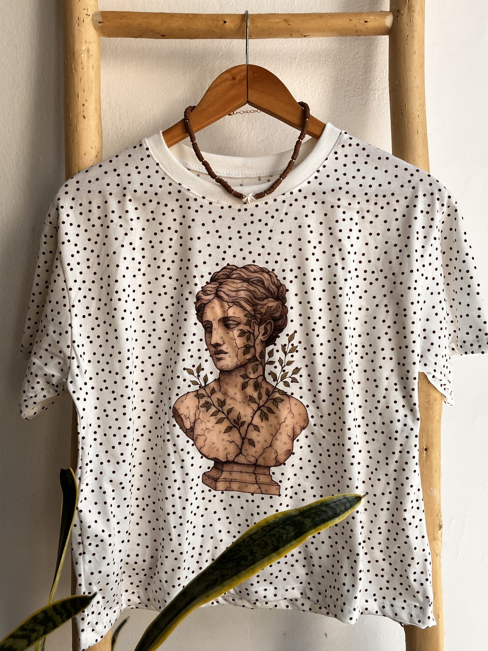 Remera de algodón con tono blanco con delicados lunares marrones y estampa central de busto clásico con detalles botánicos. Su diseño artístico le aporta personalidad y estilo, ideal para quienes buscan un look casual con un toque distinto. De calce cómodo y de algodón, perfecta para usar con jeans, shorts o polleras en cualquier ocasión.